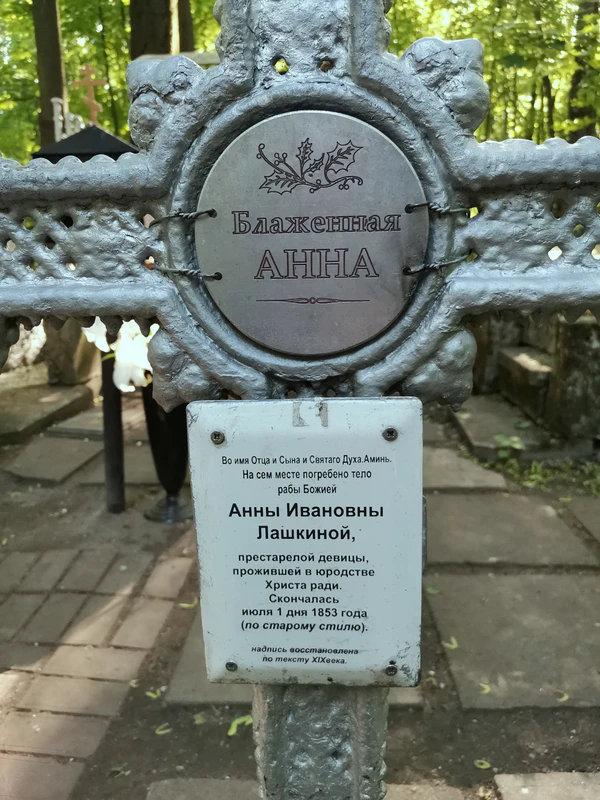 Во имя Отца и Сына и Святаго Духа. Аминь. На семъ мѣстѣ погребено тѣло рабы Божiей Анны Ивановны Лашкиной, престарѣлой дѣвицы, прожившей въ юродствѣ Христа ради. Я зналъ ее болѣе 30 летъ и была въ одномъ положенiи. Скончалась iюля 1 дня 1853 года.