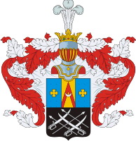 В верхней голубой половине изображены два золотых креста; между ними в золотом поле — красное стропило; на его середине — серебряная луна, обращённая рогами вверх. В нижней половине, в чёрном поле крестообразно положены серебряные сабли и пики, расположенные: две сабли, посредине пика и две пики, посредине сабля.