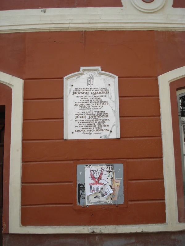 В 1999 году на стене старой университетской типографии со стороны улицы Швянто Йоно была помещена мемориальная таблица в память издателя Юзефа Завадского, который в июне 1822 года издал первый сборник знаменитого впоследствии польского поэта Адама Мицкевича Ballady i romanse («Баллады и романсы»). Этим сборником, явившимся манифестом польского романтизма[23], началась новая романтическая эпоха в польской литературе[24].