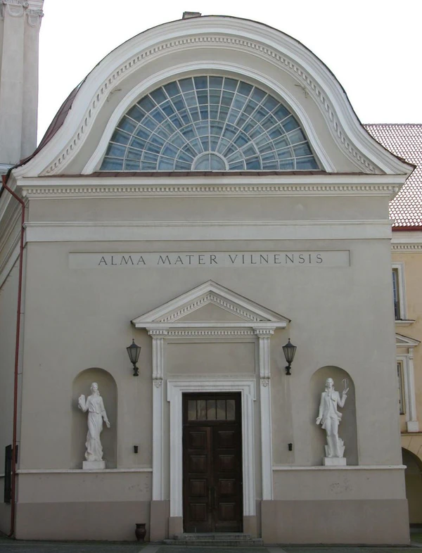 В верхней части дверей расположены бронзовые портреты Николая Христофора Радзивилла Сиротки, основавшего в 1579 года типографию в Вильне (позднее типография Виленской Академии и Университета Общества Иисуса, 1585), где в 1613 году была отпечатана первая оригинальная карта Великого княжества Литовского «Magni Ducatus Lithuaniae caeterarumque regionum illi adiacentium exacta descriptio»; виленского епископа Валериана Протасевича, основавшего виленскую иезуитскую коллегию (1570) и её библиотеку; папа римский Григорий XIII, утвердивший 29 октября 1579 года буллу об основании Виленской Академии и Университета; кардинал Юрий Радзивилл, обратившийся к папе с просьбой о предоставлении прав академии виленской коллегии; король польский и великий князь литовский Сигизмунд Август, подаривший иезуитской коллегии свою библиотеку (около 5 тысяч томов); король польский и великий князь литовский Стефан Баторий, подписавший привилегию 1 апреля 1579 года о реорганизации иезуитской коллегии в университет.