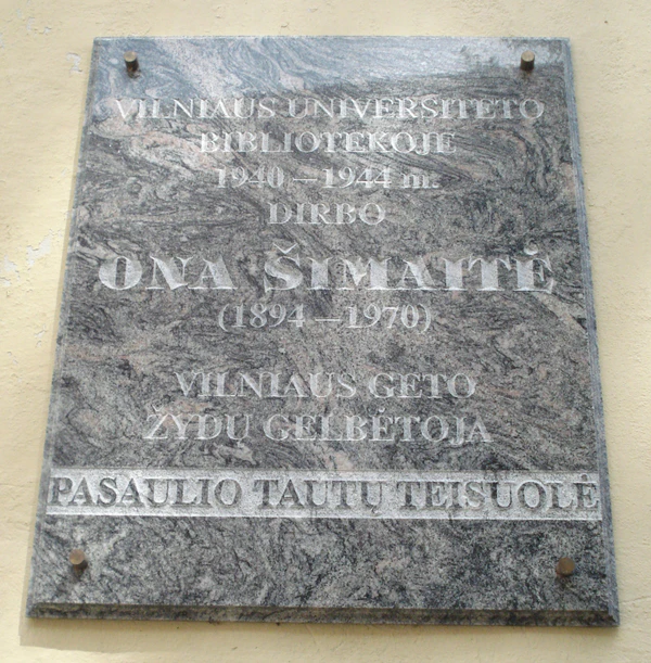 На стене северного корпуса, рядом с входом в Институт идиш, установлена мемориальная плита в память Оны Шимайте (1894—1970), праведницы мира. Она во время Второй мировой войны работала в библиотеке Вильнюсского университета и оказывала помощь заключённым Вильнюсского гетто. По разрешению оккупационных властей собирать в гетто книги, взятые студентами до войны из библиотеки, она носила в гетто продукты, выносила из гетто письма и записки узников. Схваченная при попытке вывести из гетто еврейскую девочку, Она Шимайте была подвергнута пыткам и затем отправлена в концлагерь.[17]