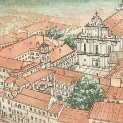 Ансамбль начал формироваться около 1570 года в ранее уже застроенном каменными строениями квартале во владениях виленского епископа. Учреждённая в 1579 году иезуитская Академия и Университет приобретала новые дома, расширяя свои помещения в северном и восточном направлениях. В зданиях ансамбля располагались поочерёдно иезуитская коллегия, преобразованная в Академию и Университет Общества Иисуса, затем Главная виленская школа, императорский Виленский университет, гимназия, Музей древностей и Виленская археологическая комиссия, позднее Публичная библиотека и архив, а также астрономическая обсерватория, в 1919—1939 годах — Университет Стефана Батория. Ныне в помещениях ансамбля располагаются администрация, библиотека, философский, исторический и филологический факультеты Вильнюсского университета.