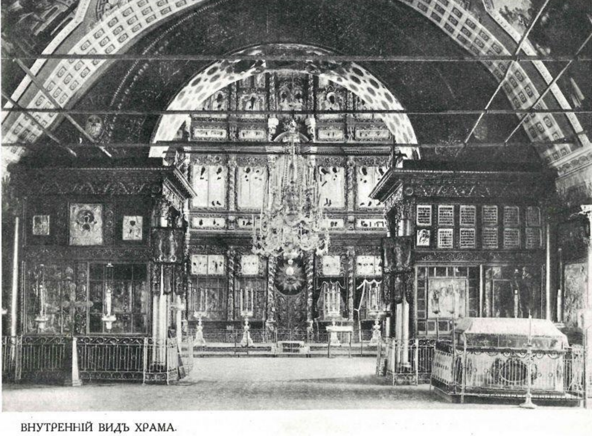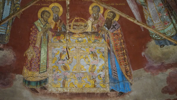 Роспись свода посвящена преимущественно ветхозаветным темам. В куполе барабана написан Саваоф. В простенках — архангелы; в центральной части восточного лотка была изображена Голгофа, которая одновременно играла роль фона для Распятия, завершавшего иконостас.
