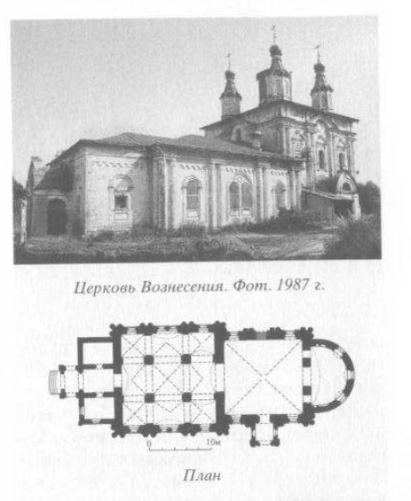 Церковь Вознесения, построенная в 1863 году, играет в ансамбле подчинённую роль. Композиция более позднего тёплого храма состоит из основного двусветного четверика, чуть суженной полуциркульной апсиды, четырёхстолпной трапезной и притвора западного входа. Все эти составляющие размещены на общей продольной оси.