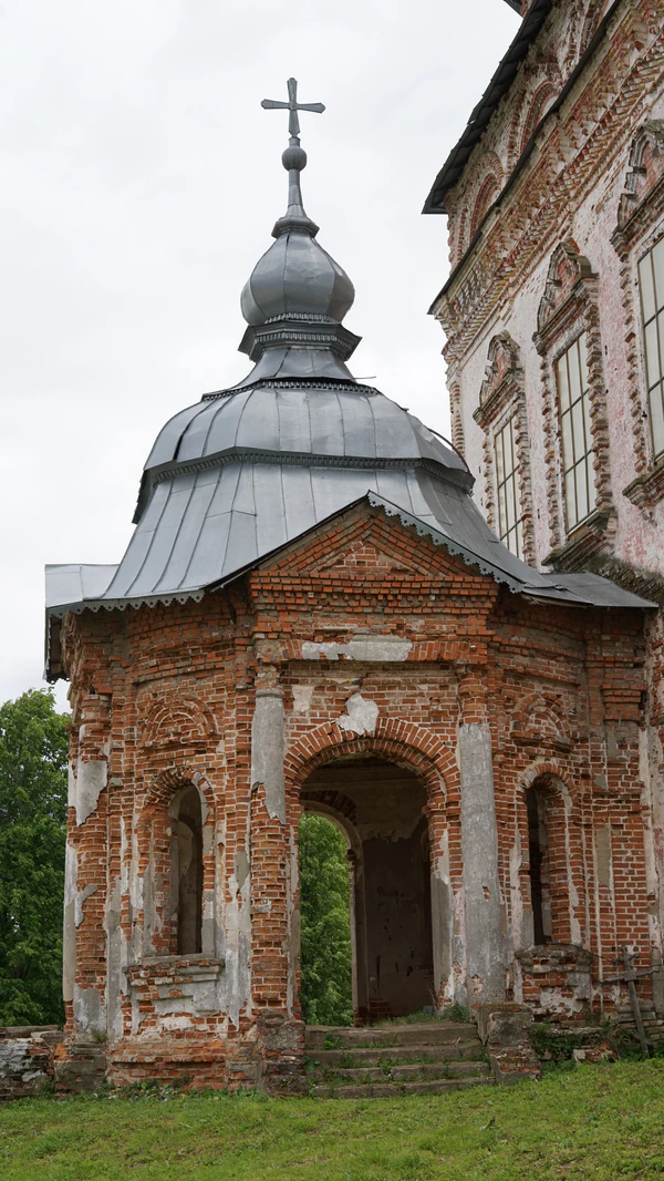 Одночастная апсида имитирует трёхчастную. Её «лепестки» внешне разделяются колонками, но внутри имеют единый объём. Сложная форма придаётся и приделам, пристроенным в середине XIX века. Оформленные снаружи как восьмерики, в интерьере они имеют овальную форму. Храм декорирован двумя ярусами кокошников, один из которых «поддерживает» пятиглавие. Дуги кокошников украшены поребриком и дентикулами. Боковые фасады четверика декорированы пучками тройных колонок в углах, наборным фризом с поребриком, мотивом «пилы» и городков. Во внешнем убранстве церкви активно используется руст. Им оформлены углы каждого яруса и пилястры, фланкирующие верхние окна. Нижний ряд окон украшен набором мелких бусин. Наличники обоих ярусов завершаются разорванными гребнями, увеличивающимися во втором свете. Таким образом, декор храма варьируется от яруса к ярусу, делая его менее однообразным и приглушая вертикальную направленность постройки.