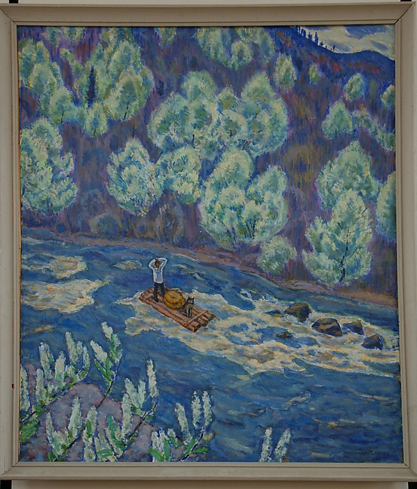 На полотне представлен горно-лесной пейзаж с видом сверху. В центре переднего плана изображена цветущая ветка с густыми, светлыми соцветиями, устремлёнными вверх. Ниже по композиции располагается горная река с порогами и быстрым течением, по которой плывёт небольшой плот. На плоту стоит мужчина в белой рубахе, закинув руки за голову, рядом с ним находятся низкий круглый столик и собака. На другом берегу возвышаются зелёные горы. Работа выполнена преимущественно в сине-зелёной цветовой гамме, что подчёркивает весенний характер сцены.