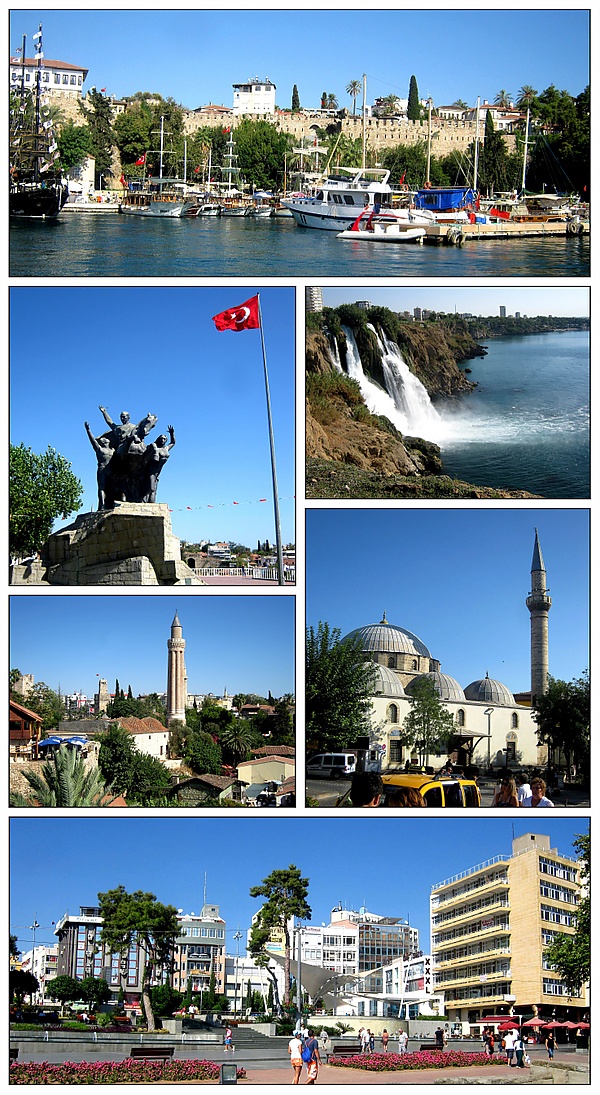 - Район площади Республики и Калеичи (Старый город): дом-музей Ататюрка, мечеть Муратпаша, мечеть Текели Мехмета-паши, минарет Йивли, мечеть Искеле, Адриановы ворота, башня Хыдырлык, часовая башня;