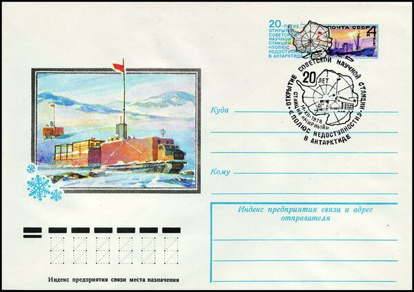 Конверт с оригинальной маркой «20-летие открытия советской научной станции „Полюс недоступности“ в Антарктиде», СССР, 1978 (СК #41). Художник Ю. Косоруков. Спецгашение: станция Мирный, 14.12.1978