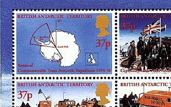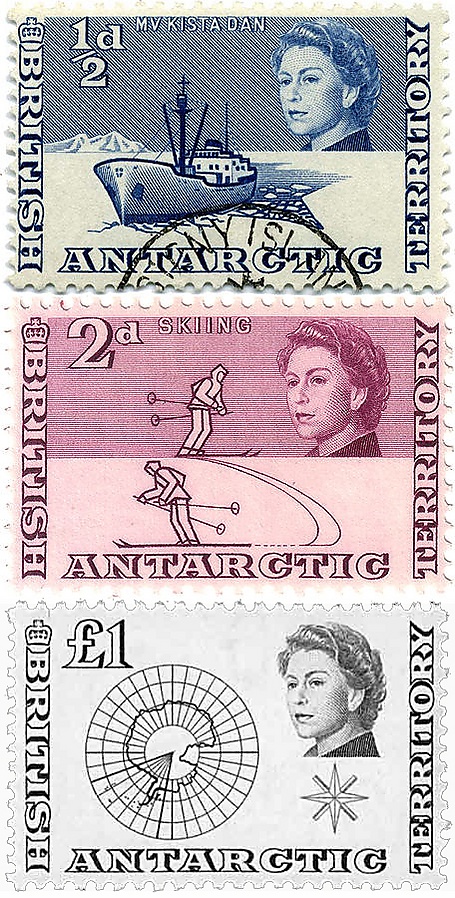 Великобритания выпускает отдельные почтовые марки для БАТ с 1963 года. Первая серия БАТ была посвящена освоению Антарктиды и представляла различные виды человеческой деятельности на этом материке. Она состояла из марок 15 номиналов от полупенни до одного фунта стерлингов и, естественно, сопровождалась портретом королевы Елизаветы II. В 1971 году при переходе Великобритании к десятичной денежной системе серия была надпечатана цифрами новых номиналов[9].
