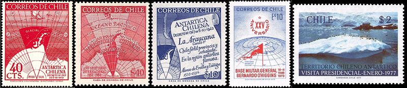 «Чилийская Антарктика» на марках Чили разных лет: 1947 (Sc #247-248); 1958 (Sc #305); 1958 (Sc #310); 1973 (Sc #434); 1977, визит президента Аугусто Пиночета в Чилийскую Антарктику (Sc #497)