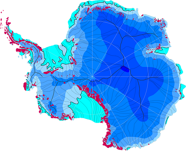Восточно-антарктический ледяной щит — это огромный ледяной «корж» площадью 10 млн км² и диаметром более 4 тысяч км. Поверхность льда, скрытая под 100—150-метровой толщей снега и фирна, образует огромное плато со средней высотой около 3 км и максимальной высотой в его центре до 4 км. Средняя толщина льда Восточной Антарктиды равняется 2,5 км, а максимальная — почти 4,8 км. Существенно меньшие размеры имеет Западно-антарктический ледяной щит: площадь менее 2 млн км², средняя толщина — лишь 1,1 км, поверхность не поднимается выше 2 км над уровнем моря. Фундамент этого щита на больших площадях погружён ниже уровня океана, его средняя глубина около 400 м.