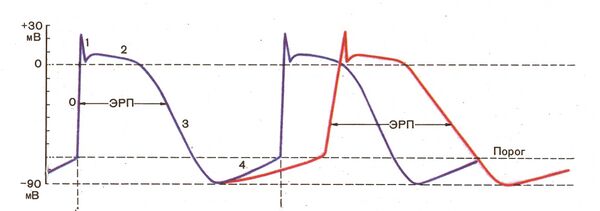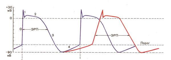 - Фаза 4 — медленная диастолическая деполяризация. Возникает благодаря входящему кальциевому току в узлах и входящему натриевому току в остальных отделах проводящей системы сердца.