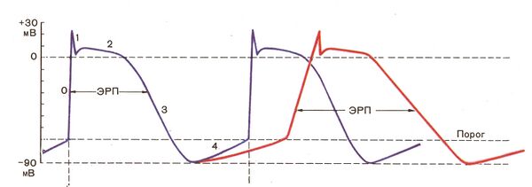 Потенциал действия патологических путей атриовентрикулярного проведения: Кента и Джеймса очень похож на таковой у ножек пучка Гиса и волокон Пуркинье. Эти пути также возбуждаются входящим натриевым током.