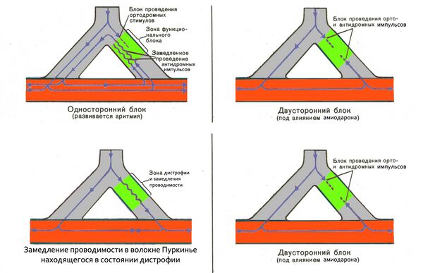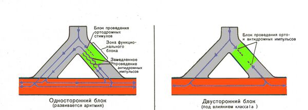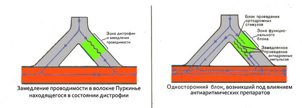 В волокнах Пуркинье есть участки, находящиеся в состоянии дистрофии, в которых электрический импульс, пусть и замедленно, но распространяется к миофибрилле рабочего миокарда. Антиаритмические препараты группы I блокируют натриевые каналы и способствуют возникновению в таких участках неполного однонаправленного блока и возникновению аритмий повторного входа возбуждения (re-entry; Рис. 9). Чем более у препарата выражено блокирующее действие на натриевые каналы, тем сильнее его аритмогенное действие. Именно поэтому препараты группы Ic имеют наибольшую аритмогенность , группы Ia — умеренную, группы Ib — незначительную. Способность провоцировать аритмии является основным лимитирующим фактором длительного применения препаратов группы I.
