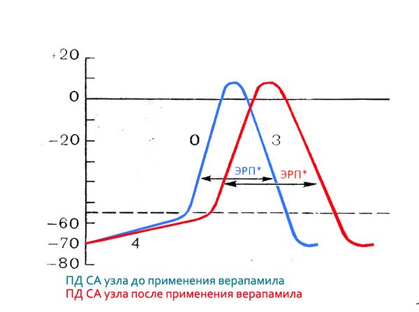 При аритмиях используются представители только первых двух групп: фенилалкиламины (верапамил, галлопамил) и бензотиазепины (дилтиазем). БКК используется для лечения наджелудочковых аритмий: синусовой тахикардии (оказывает отрицательное хронотропное действие), наджелудочковой пароксизмальной тахикардии, мерцательной аритмии и др. Эта группа снижает возбудимость узлов и межпредсердных путей быстрого проведения, тормозя фазу 0 и фазу 3 (Рис. 12). На атриовентрикулярный узел БКК оказывают отрицательное дромотропное и батмотропное действие. Увеличивая ЭРП узла, они частично блокируют проведение импульсов из предсердий в желудочки и переводят тахисистолическую форму в эусистолическую. Но кальциевые антагонисты противопоказаны при синдромах Вольфа-Паркинсона-Уайта и Клерка-Леви-Кристеско, так как замедляя узловую проводимость, они могут провоцировать развитие реципроктной пароксизмальной тахикардии: импульс быстрее достигает атриовентрикулярного узла антидромно. На рабочий миокард БКК оказывают отрицательное инотропное действие, которое компенсируется снижением ОПСС, поэтому сердечный выброс меняется назначительно. В целом, БКК хорошо переносятся и обладают низкой аритмогенностью.