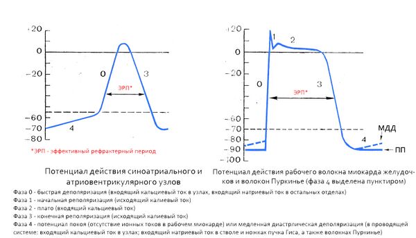 Потенциал действия узлов значительно отличается от потенциала действия других областей сердца. В нем практически отсутствуют фаза 1 и фаза 2.