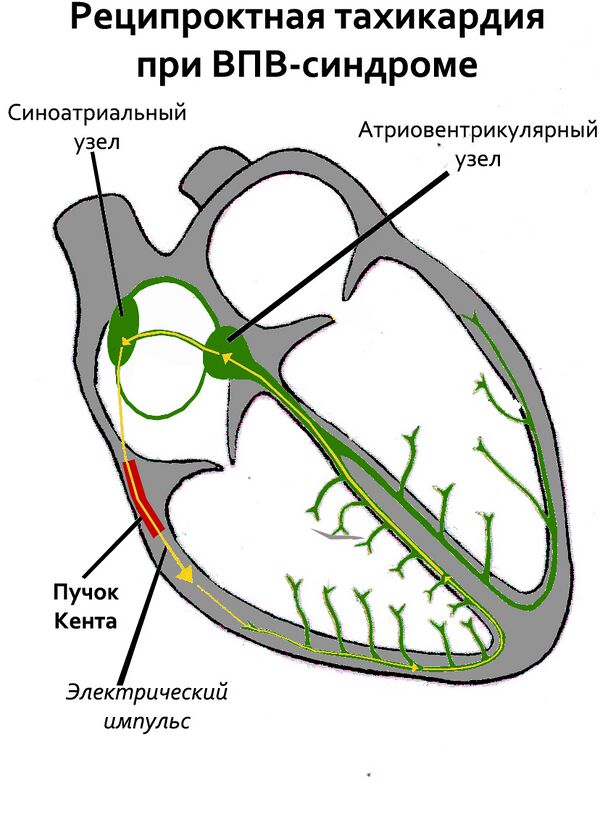 При синдромах Вольфа-Паркинсона-Уайта и Клерка-Леви-Кристеско при замедлении узловой атриовентрикулярной проводимости импульс быстрее достигает желудочков по патологическим быстрым путям предсердно-желудочкового проведения: Кента и Джеймса соответственно. При синдроме Вольфа-Паркинсона-Уайта импульс напрямую по Пучку Кента устремляется в миокард желудочков, затем ретроградно попадает в волокна Пуркинье, далее — в пучок Гиса и атриовентрикулярный узел. Затем — в миокард предсердий и опять через пучок Кента — в желудочки (Рис 4.).[5] При синдроме Клерка-Леви-Кристеско электрический стимул по быстрому пучку Джеймса, минуя атриовентрикулярный узел, напрямую попадает в ствол пучка Гиса. А оттуда антидромно в атриовентрикулярный узел, миокард предсердий и вновь в пучок Джеймса и желудочки. Это так называемое macro re-entry. Пароксизмальная тахикардия, возникшая подобным образом, называется реципрокной.