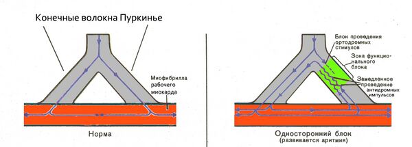 Аритмии, связанные с органическими заболеваниями сердца (ишемическая болезнь сердца, инфаркт миокарда, миокардиты и др.) чаще возникают именно по механизму повторного входа возбуждения. При этом в одном из конечных волокон Пуркинье возникает неполный однонаправленный блок проведения возбуждения к миофибрилле рабочего миокарда предсердий или желудочков (рис. 3). Но в этом же месте сохраняется способность антидромного проведения импульса. Если импульс зацикливается один-два раза — возникает экстрасистолия, если три и более — пароксизмальная тахикардия. Это micro re-entry.[7]