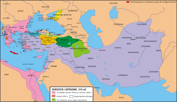 Антигон стал правителем большей части азиатских владений империи Александра в 316/315 году до н. э. Несмотря на территориальное расположение своей державы, Антигон при формировании армии и распределении административных должностей в первую очередь полагался на греков и македонян. Для того чтобы привлечь греческие полисы на свою сторону и обеспечить их лояльность, Антигон мирился с их автономным статусом, который предполагал, в частности, отсутствие на их территориях гарнизонов Антигона. Этот принцип взаимодействия монарха и греческих полисов стал типичным для всех последующих эллинистических царей[345].