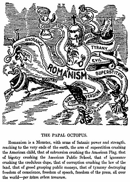 Антикатолицизм достиг своей высшей точки популярности в середине XIX века, когда высшие слои США, состоявшие из протестантов, были встревожены большим притоком мигрантов из Ирландии и Южной Германии. Тогда стала популярной точка зрения о том, что Католическая церковь является Вавилонской блудницей из Книги Откровения.