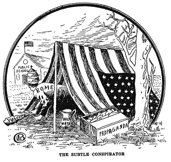 В 1869 религиозный вопрос обострился, когда Таммани Холл, в которой состояло много католиков, попросил выделить из государственного бюджета 1,5 миллиона долларов на строительство католических школ. В 1875 появилась карикатура, изображающая римско-католических епископов как крокодилов, готовящихся напасть на протестантские государственные школы при попустительстве политиков-католиков.