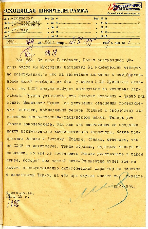 Докладная записка наркома иностранных дел СССР М. М. Литвинова генеральному секретарю ЦК ВКП(б) И. В. Сталину о возможном присоединении Венгрии к Антикоминтерновскому пакту и целесообразности сделать правительству Венгрии предупреждение, с текстом соответствующего проекта постановления (проект утверждён Политбюро ЦК ВКП(б) 7 января 1939 г.)
