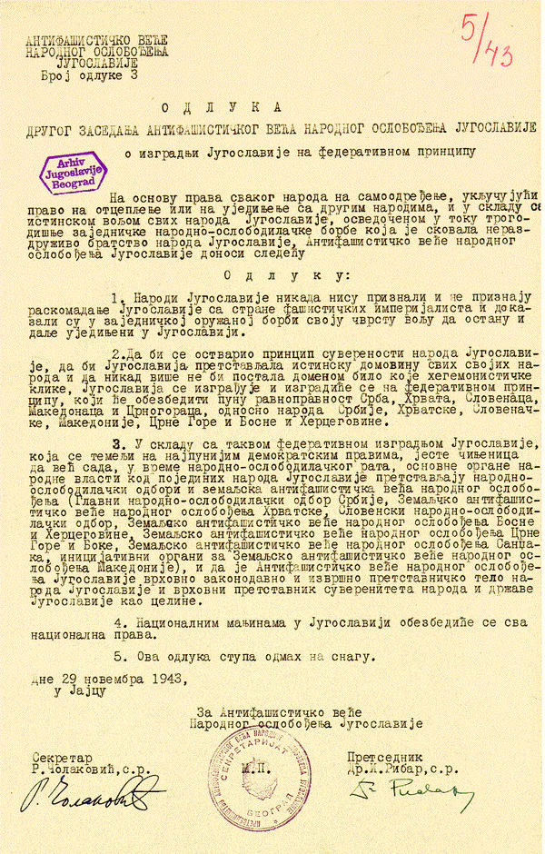 На втором заседании АВНОЮ 29 и 30 ноября 1943 года в городе Яйце было принято решение об образовании «Национального комитета по освобождению Югославии» с функциями временного правительства. Был одобрен план создания конституции Югославии как федеративной и демократической страны, и признание национальных прав всех народов страны. На заседании АВНОЮ присутствовали 142 делегата.