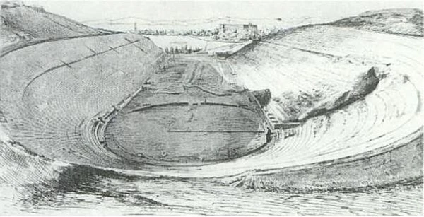 Согласно более позднему греческому путешественнику Павсанию, который писал в 175 году нашей эры, единственным соревнованием, проводившимся поначалу, был стадион или забег на дистанцию около 190 метров, но потом к нему присоединились гонки на колесницах, борьба и пентатлон. Слово стадион происходит от этого вида соревнования.