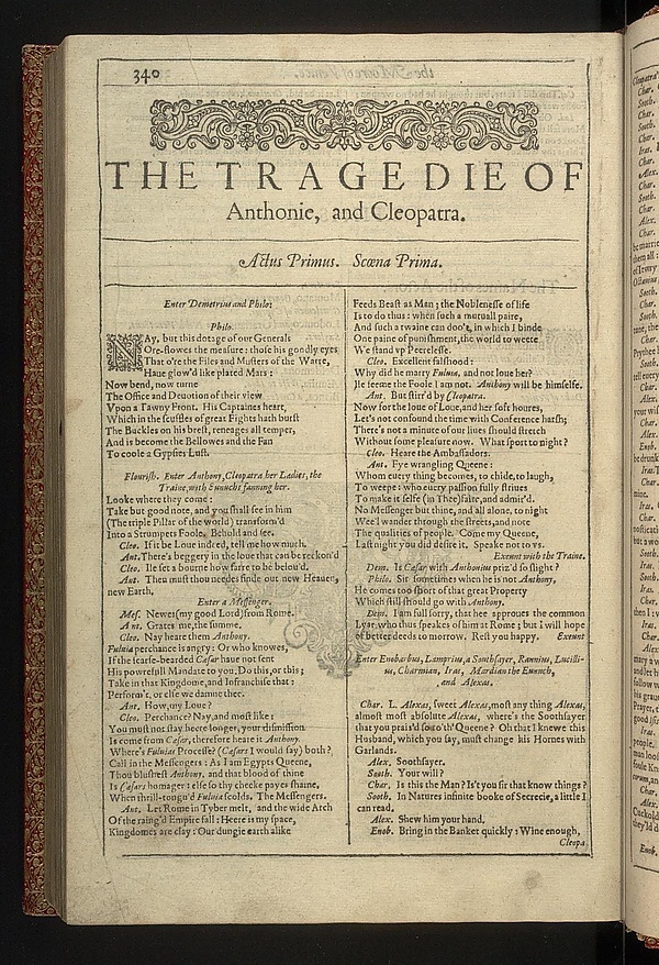 «Анто́ний и Клеопа́тра» (англ. Antony and Cleopatra, в Первом фолио The Tragedie of Anthonie, and Cleopatra) — трагедия Уильяма Шекспира с сюжетом, основанном на переводе Плутарховского жизнеописания Марка Антония, выполненного Томасом Нортом с французского перевода Жака Амио. Пьеса была впервые поставлена «Слугами короля» в театре Блэкфрайарс или в театре «Глобус» примерно в 1607 г.[1][2] её первое появление в печати произошло в фолио 1623 г. Написана либо в 1607, либо в 1603—1604 гг.