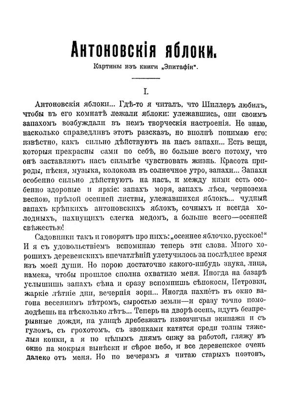 Желание опоэтизировать старопомещичий быт, прозвучавшее в письме к Пащенко, воплотилось через девять лет в рассказе «Антоновские яблоки», основная тема которого связана с лирическими воспоминаниями об уходящей в прошлое дворянской культуре[4]. «Антоновские яблоки» были впервые опубликованы в журнале «Жизнь» в 1900 году, однако работу над шлифовкой текста Бунин не прекращал в течение двух десятилетий. Так, готовя рассказ к включению в сборник «Перевал» (1912), Иван Алексеевич изъял из произведения несколько первых абзацев, начинавшихся так: