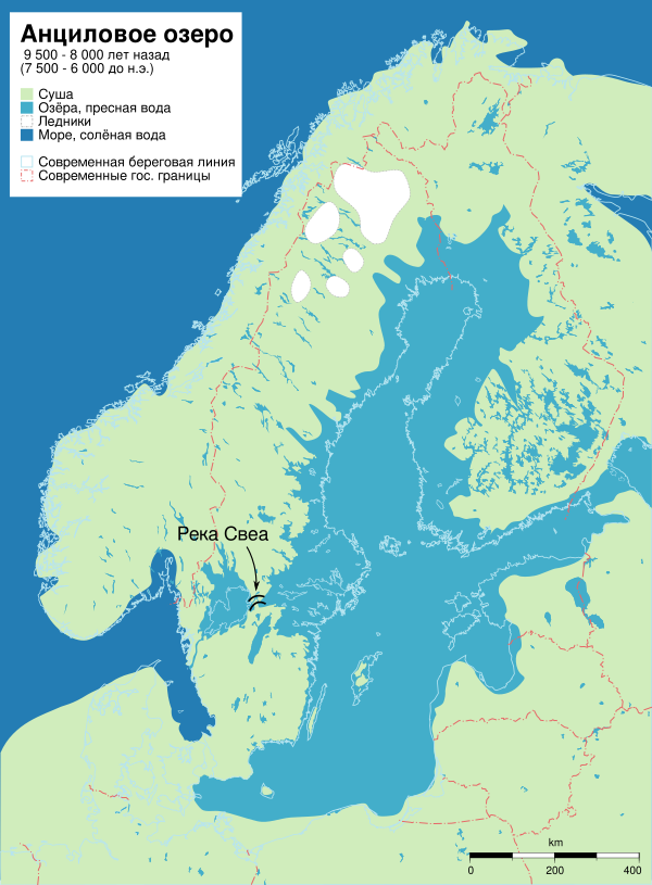 На момент окончания предыдущей (Иольдиевой) стадии сток из Балтийского бассейна осуществлялся через пролив,[К 2] проходивший по территории современной Среднешведской низменности: через озёра Меларен и Ельмарен, современную провинцию Нерке, далее через низменности к западу от горы Биллинген и котловину озера Венерн, которая сообщалась с Северным морем через 2 пролива в долинах современных рек Гёта-Эльв и Стейнсэльве[4]. Датские проливы не функционировали, а между Швецией и континентальной Европой существовал широкий сухопутный мост.