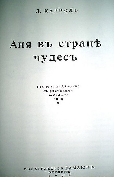 - Л. Кэрролл. Аня в стране чудес / Перев. с англ. В. Сирина, с рис. худ. С. А. Залшупина. — Б.: Гамаюн, 1923. — 114 с.