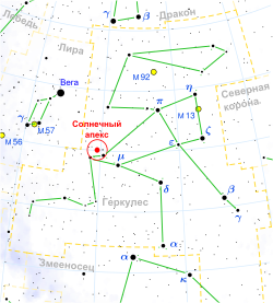 - Солнце движется относительно ближайших звёзд (относительно локального стандарта покоя) со скоростью 20 км/с с апексом, имеющим экваториальные координаты α = 270°, δ = 30° (в созвездии Геркулеса). При этом Солнце движется вместе с этими звёздами вокруг центра Галактики со скоростью 220 км/с.