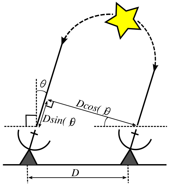 Предположим, имеется две антенны, расстояние (база) между которыми может меняться до некоторого предельного . Если эти две антенны навести на один объект, то излучение объекта создаст на их приемниках напряжения и . При этом и это один и тот же сигнал, только сдвинутый на время прохождения добавочного расстояния (см. илл.). Доказано[1], что взаимнокорреляционная функция этих сигналов будет связана с антенной температурой: