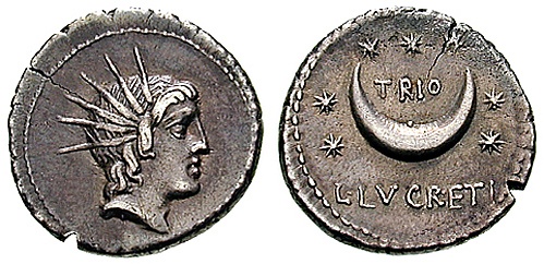 В Древнем Риме культ Аполлона был официально принят в первой половине V столетия до н. э. В городе чеканка монет находилась в ведении сената, который назначал монетариев, ответственных, в свою очередь, за технологический процесс выпуска и самостоятельно определявших изображения аверса и реверса. Характерной традицией республиканской эпохи стало создание таких монетных типов, которые были каким-то образом связаны с родом монетария, прославляли его богов-покровителей. Тот факт, что Аполлона на монетах помещали монетарии нескольких десятков родов, свидетельствует о возросшем почитании данного бога в Римской республике II—I столетий до н. э.[235]