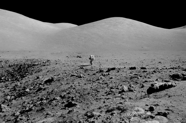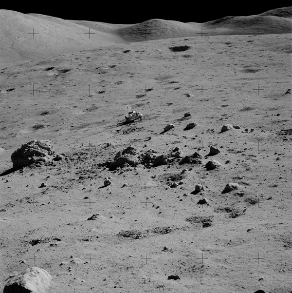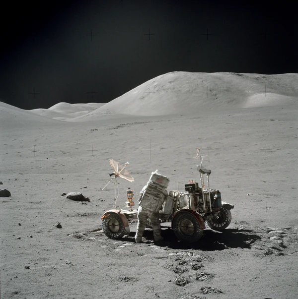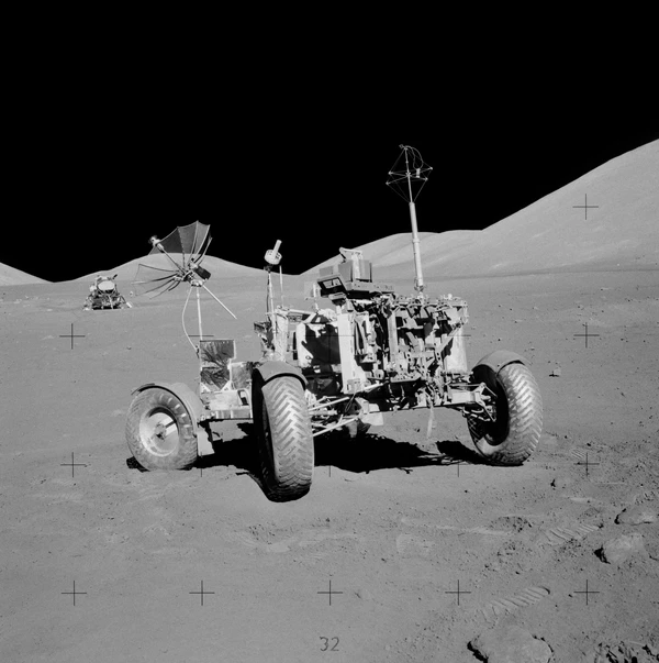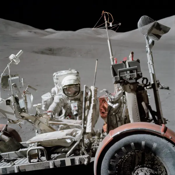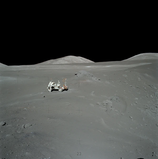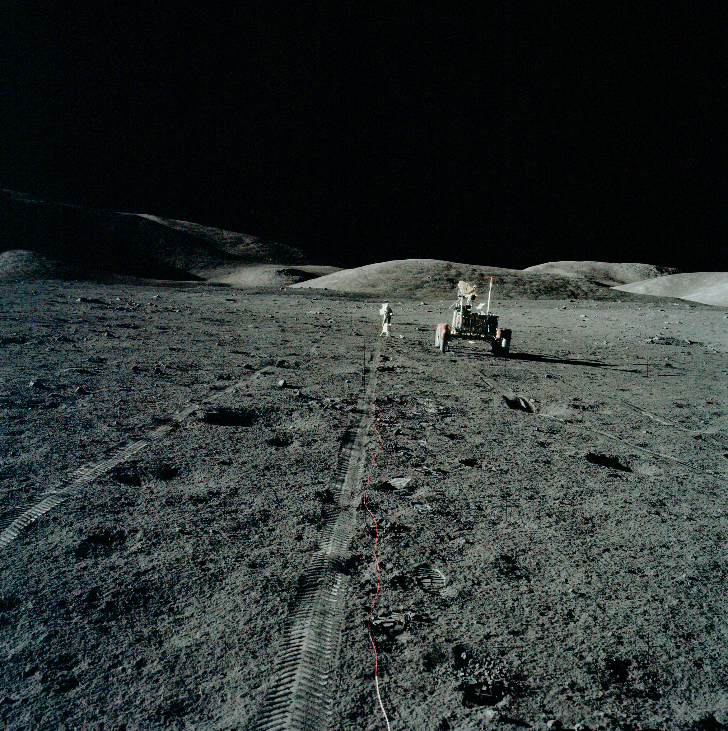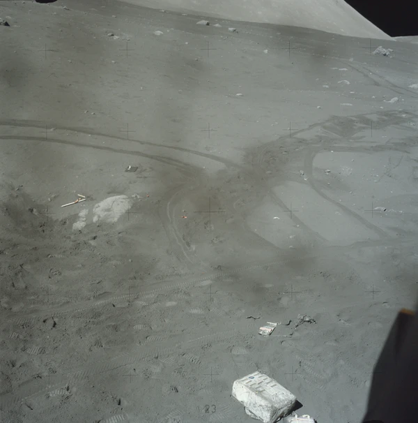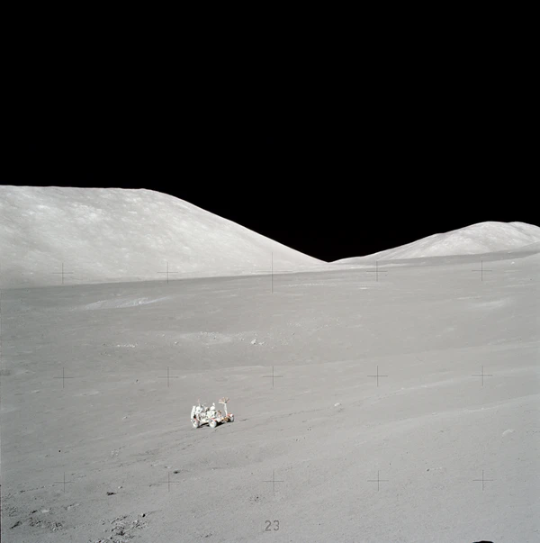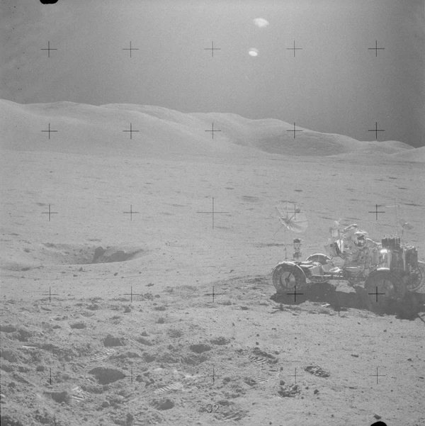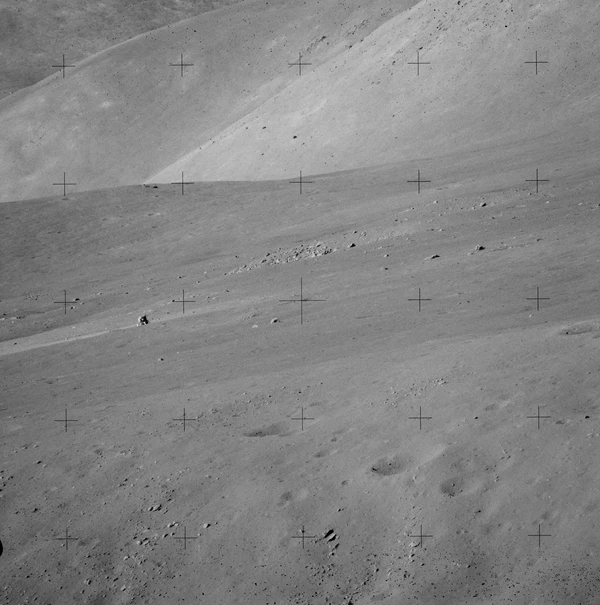 Осматриваясь, Сернан сообщил, что лунный модуль сел одной опорой в неглубокий кратер, похожий на мелкую обеденную тарелку. Вскоре к командиру присоединился и Шмитт. Астронавты первым делом выгрузили «Лунный Ровер». Сернан совершил пробную поездку, которая показала, что луномобиль полностью исправен. Шмитт снимал пробный заезд на фотокамеру. Когда Сернан к нему приближался, Шмитт немного отошёл назад. Он хотел, чтобы в кадр попала и Земля. Она находилась всё время в одной и той же точке небосвода, над Южным массивом, с возвышением на 45° над горизонтом. Но в кадр она так и не попала (астронавты поймут, как её нужно фотографировать, чуть позже)[21].