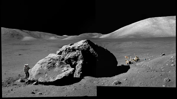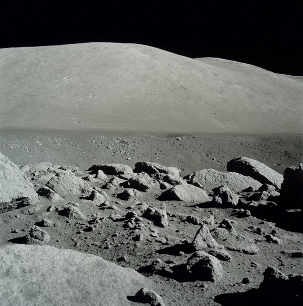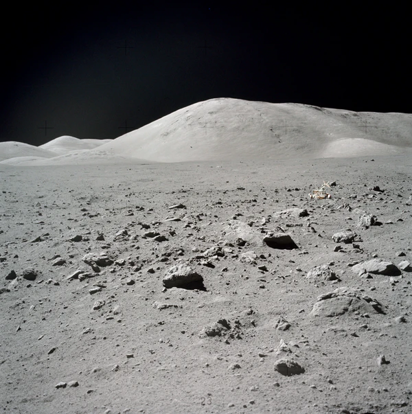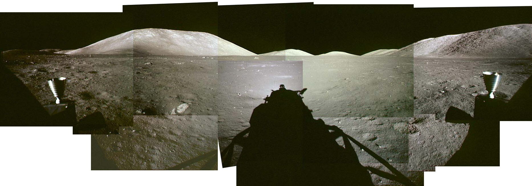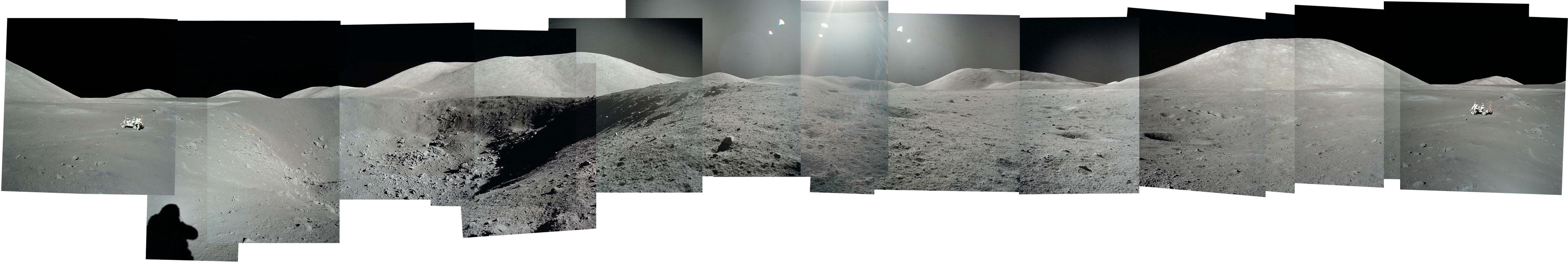 | Панорама из снимков, сделанных Сернаном и Шмиттом через иллюминаторы «Челленджера» перед первым выходом на поверхность. Вдали, чуть левее центра, Южный массив, справа — Северный массив |