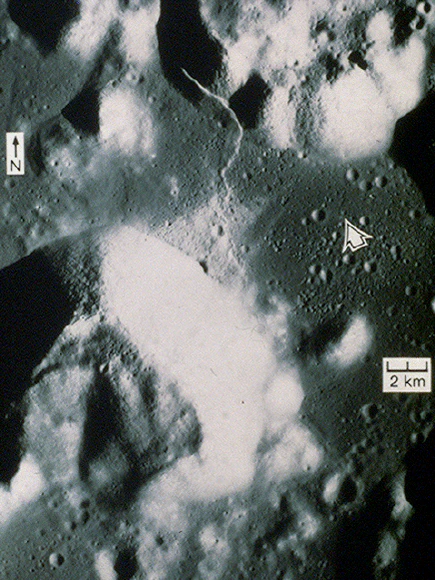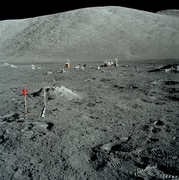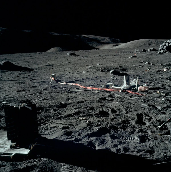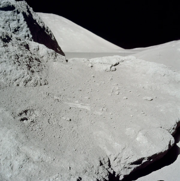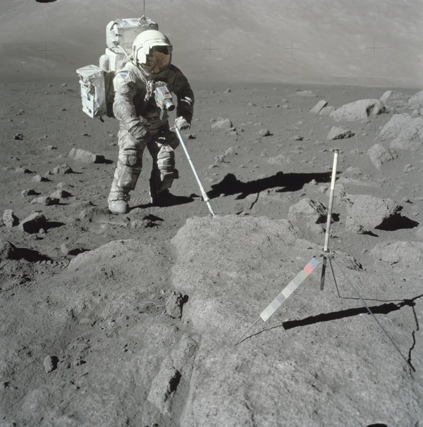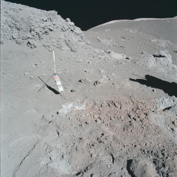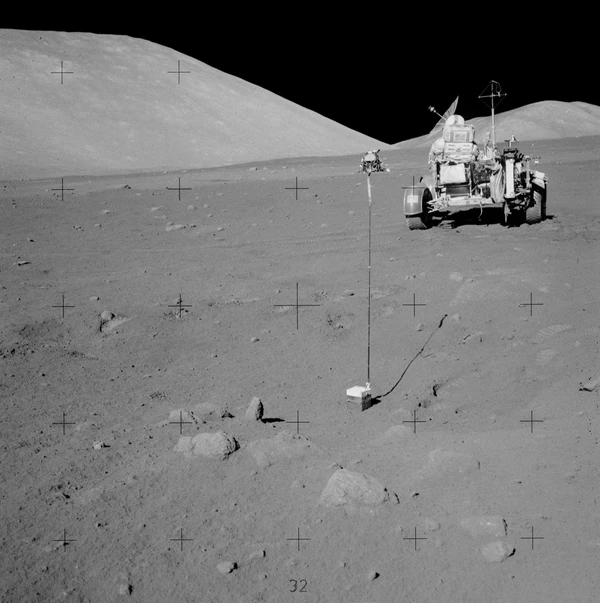 - Эксперимент по сейсмическому профилированию. В ходе эксперимента, после отлёта астронавтов с Луны, по командам с Земли были подорваны восемь зарядов взрывчатки массой от 57 г до 2,7 кг. Эксперимент показал, что скорость распространения сейсмических волн в верхних нескольких сотнях метрах коры составляет от 0,1 до 0,3 км/с. Это намного меньше скорости, характерной для цельных горных пород на Земле, но согласуется с сильно растрескавшимся, брекчиевидным материалом, который образуется на Луне в результате длительной метеоритной бомбардировки. Было установлено, что в месте посадки «Аполлона-17» поверхностный слой базальта имеет толщину 1,4 км, что немного превышает значение в 1 км, полученное с помощью мобильного гравиметра[62].