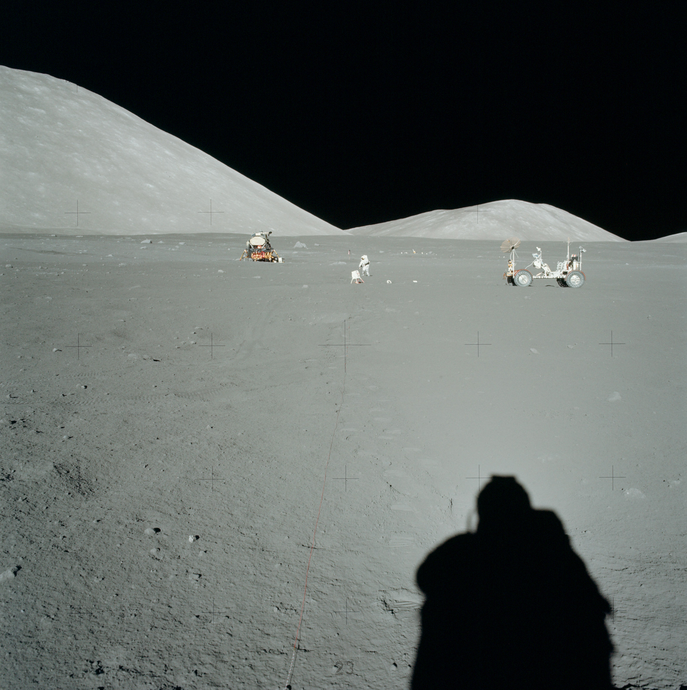 Далее Шмитт загрузил на «Ровер» инструменты, а Сернан поставил на него лунный передатчик информации (англ. Lunar Communications Relay Unit — LCRU), устройство управления телевизионной камерой по командам с Земли, саму телекамеру и две антенны. Вскоре на Земле получили телевизионную картинку с Луны[22]. Затем астронавты сделали первые измерения с помощью портативного мобильного гравиметра, который они установили на «Ровер», и водрузили недалеко от лунного модуля флаг США. Это был флаг, висевший на стене главного зала ЦУПа несколько лет (со времени полёта «Аполлона-11»), на протяжении которых были осуществлены все предыдущие посадки на Луну. У экипажа «Аполлона-17» был с собой и ещё один флаг США. Астронавты привезут его обратно на Землю и передадут ЦУПу взамен старого. Сначала Шмитт сфотографировал Сернана у флага. Затем камеру взял командир. Он согнул ноги в коленях, почти встал на колени, чтобы запечатлеть и Землю. Но с первого раза она в кадр тоже не попала. Хорошо получился второй дубль. Шмитт тоже попробовал так сфотографировать Сернана. Вышло с третьего раза. После этого астронавты разместили на двух опорах лунного модуля детекторы космических лучей (один в постоянной тени, другой — на солнце) и погрузили на «Ровер» приёмник-передатчик для эксперимента по определению электрических свойств поверхности и заряды взрывчатки для эксперимента по построению сейсмического профиля[23].