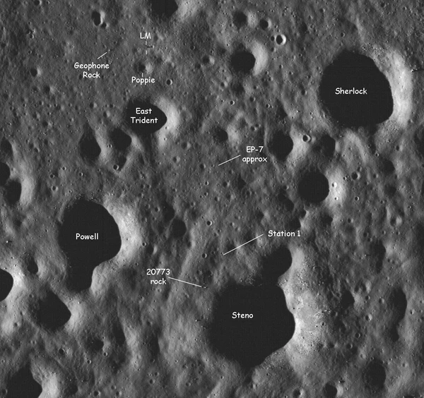 Скала, у которой работали астронавты, после полёта получила несколько названий: англ. Station 6 Boulder (Rock), Split Boulder (Rock) и скала Tracy's Rock (по имени дочери Сернана). По возвращении астронавтов на Землю снимки скалы на Station 6 были напечатаны во многих газетах и журналах. Астронавт «Аполлона-12» Алан Бин, ставший после ухода из НАСА художником, захотел нарисовать астронавтов у этого валуна. Он встретился с Сернаном, чтобы расспросить его о деталях. Во время беседы Сернан сказал, что, если бы он знал, что фотографии скалы станут такими известными, он написал бы что-нибудь на лунной пыли, например, имя своей дочери Трейси, которой на момент полёта было 9 лет. Бин попросил Сернана написать на листе бумаги, как именно он написал бы имя дочери. Когда картина была готова, Бин пригласил Сернана приехать посмотреть, что получилось. В том месте на скале, где Сернан брал образцы лунной пыли, было написано имя его дочери. По словам Бина, нарисовав эту картину, он избавил коллегу от хлопот, связанных с повторным полётом на Луну для написания имени, а налогоплательщиков — от расходов по отправке Сернана[47].