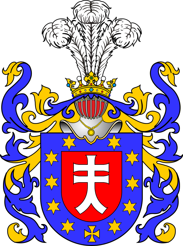 В поле лазоревом, усыпанном золотыми звёздами и в оконечности означенным кавалерским крестом, щиток, в красном поле которого серебряный дважды перекрещённый и вниз раздвоенный крест (ср. герб Юньчик)[1].