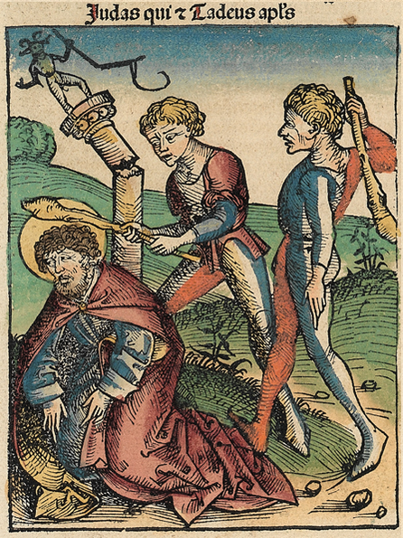 Согласно преданию, апостол Иуда проповедовал в Палестине, в Аравии, Сирии и Месопотамии, и умер мученической смертью в Армении во второй половине I века н. э. Предполагаемая могила расположена на территории армянского монастыря святого Фаддея на северо-западе современного Ирана. Часть мощей святого Апостола пребывает в Ватикане в Соборе Святого Петра. Небольшая часть мощей апостола находится в базилике апостола Андрея Первозванного в Кёльне (Германия)[2].