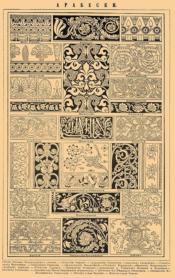 Орнамент «арабеска» возник на арабском Востоке, получил распространение в Византии, в средневековом романском и готическом искусстве иллюминирования манускриптов, а затем, в XIV—XV веках под влиянием испано-мавританского искусства нашёл применение в орнаментальной гравюре и расписной итальянской майолике эпохи Возрождения.