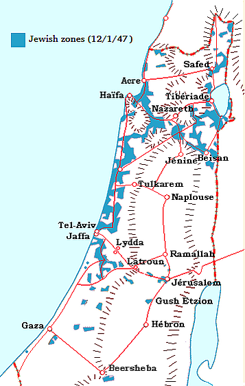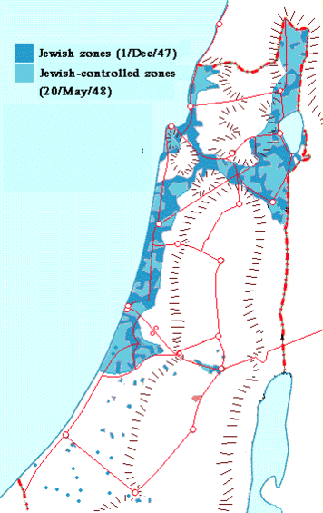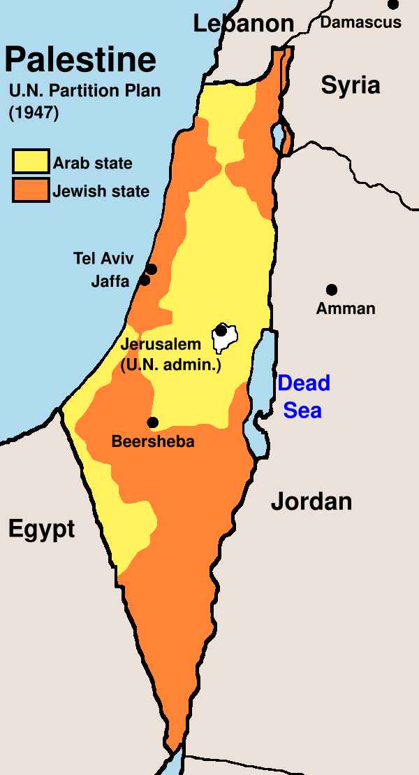 Согласно резолюции № 181 Генеральной ассамблеи ООН от 29 ноября 1947 года о разделе британской колонии Палестина, на её территории должны были быть созданы два независимых государства — еврейское и арабское, а также Большой Иерусалим — территория, подконтрольная ООН. Каждое из государств должно было состоять из трёх территорий, граничащих друг с другом лишь углами.