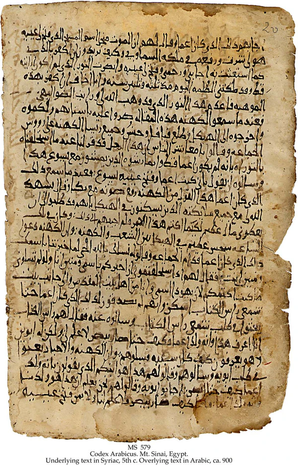Древнейшая арабская датированная рукопись — Синайский кодекс (cod. Sinai arab. 151), содержащий Деяния Апостолов и соборные послания. Он был переписан в 867 году почерком, переходным от насха к куфическому. Сохранились и другие рукописи IX века, содержащие Послания Павла, переведённые с несторианской Пешитты, а также ветхозаветную книгу Иисуса Сирахова, и другие[13]. По-видимому, ни одна арабская версия не является старше эпохи Мухаммада. Однако А. Баумштарк попытался в 1934 году обосновать доисламскую датировку арабских переводов Библии, основываясь как на литургических данных, так и соображениях, что для успешной миссионерской деятельности в Аравии были нужны евангельские тексты на местных языках[14].