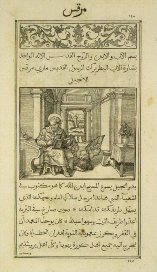 Арабские Евангелия по александрийской версии были впервые напечатаны в типографии Медичи в Риме (лат. al-Ingil al-muqaddas. Evangelium sanctum Domini Nostri Iesu Christi conscriptum a quatuor Evangelistis sanctis idest, Matthaeo, Marco, Luca, et Iohanne)[Прим 2]. На титульном листе стоит 1590 год, но в колофоне указан 1591-й. В 1591 году было выпущено второе издание с буквальным латинским переводом Антония Сиониты. Это издание было повторено в 1619 и 1774 годах; какие рукописи были положены в его основу — неизвестно[16].
