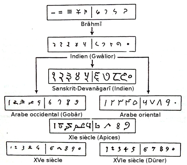 Индо-арабские цифры возникли в Индии не позднее V века[3]. Эта цифровая система была основана на принципах, проверенных всей предыдущей историей развития цифр — десятеричного, позиционного, принципа представления числовых значений и на использовании знака «ноль» для обозначения отсутствия цифры[4].