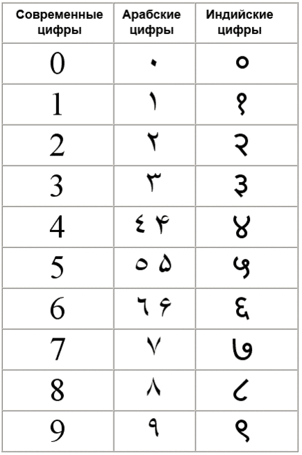 | Индо-арабские цифры, используемые в арабских странах Азии и в Египте | ٠ | ١ | ٢ | ٣ | ٤ | ٥ | ٦ | ٧ | ٨ | ٩ |