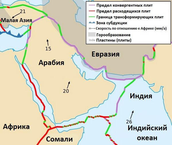 В течение фанерозоя (палеозоя — кайнозоя) Аравийская плита была частью Африканской плиты и до сих пор до конца не утратила с ней связь, так что иногда их рассматривают как составляющие единой Африкано-Аравийской платформы. Красное море появилось в начале эоцена, но отделение Африки от Аравии происходило в олигоцене, и с того времени Аравийская плита медленно смещается в направлении к Евразийской плите.