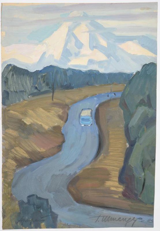 Основную часть композиции занимает извилистая дорога голубого цвета, начинающаяся в нижнем правом углу и ведущая вверх по полотну. По дороге движется автобус. Справа и на горизонте изображены тёмные массивы невысоких горных гряд. Верхнюю часть картины занимает бело-голубая вершина горы Арарат.